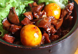 甲府の蕎麦屋の定番「甲府鳥もつ煮」。「もつ煮」というと、汁気があって長時間煮込んだものが一般的ですが、「甲府鳥もつ煮」は少量のタレを使い強火で短時間のうちに照り煮します。水気が飛んで飴状になったタレで鳥のもつをコーティング、旨味をぎゅっと閉じ込めて照りを出します。本物の蕎麦職人が絶妙な火加減とタイミングで作る、この"照り"が命なんです!戦後の昭和25年頃に、「鳥のもつ」が捨てられていてもったいない。なにか安くて美味しいものができないものか。」と甲府市内の蕎麦屋で考案。その後、蕎麦屋をはじめとする飲食店に広がっていき、今では、ほうとう、煮貝と並ぶ甲府独自の食文化となっています。